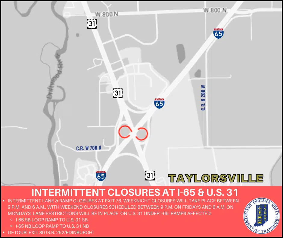 Affected ramps include the I-65 South loop ramp to southbound U.S. 31 and the I-65 North loop ramp to northbound U.S. 31. Drivers will be detoured to Exit 80 (S.R. 252/Edinburgh) when ramps are closed. Crews will work over southbound U.S. 31 in August and move to northbound U.S. 31 in September.
