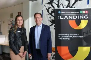 State Rep. Ryan Lauer (R-Columbus) (right) meets with Ashley Dieter (left), director of finance and operations at the Columbus Learning Center, Friday, Oct. 6, 2023.