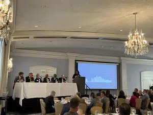 Representatives from Indiana, Purdue, Ball State and Vincennes universities, as well as Indiana State and Ivy Tech Community College, discuss higher education costs and retention plans during a panel presentation at an Indiana Fiscal Policy Institute luncheon on Thursday, Oct. 12, 2023, in Indianapolis. (Casey Smith/Indiana Capital Chronicle)