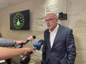 Sen. Travis Holdman, R-Markle, talks to reporters after a tax task force meeting on Wednesday, Aug. 23, 2023. Courtesy - Indiana Capital Chronicle.